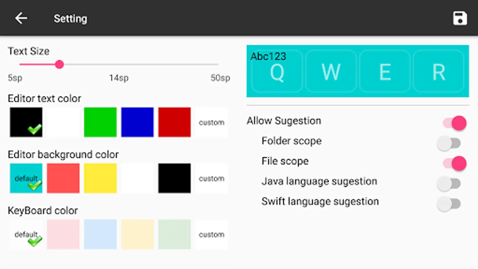 + Auto suggestion, with folder-wide keywords, file-wide keywords, and predefined Java and Swift keywords. I will add some more basic dicts if have times.