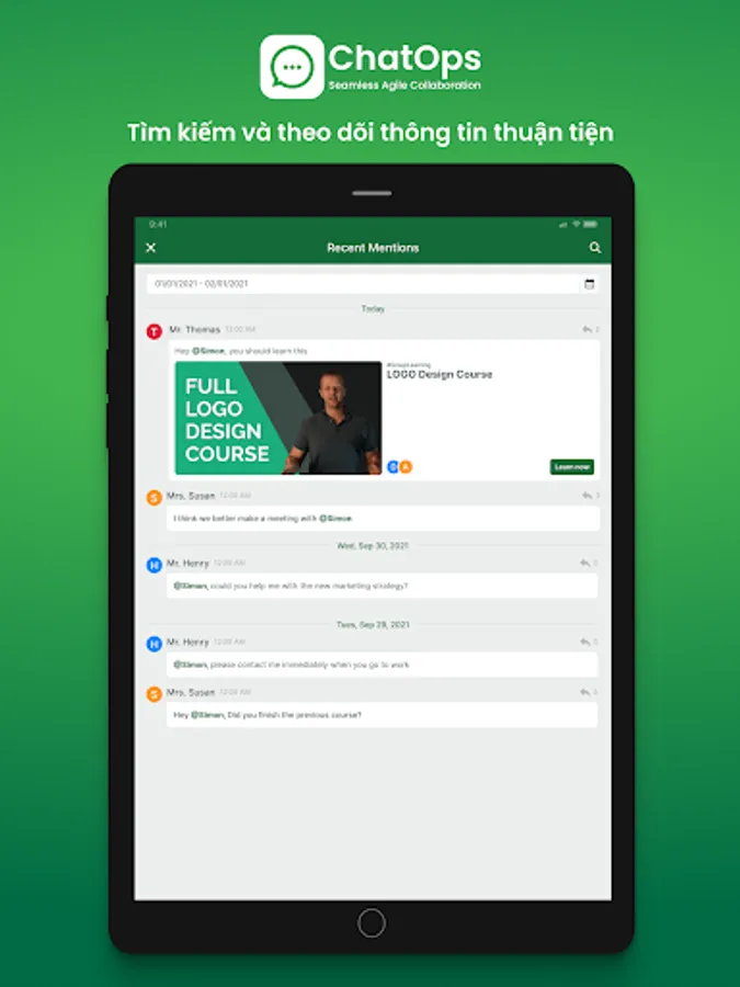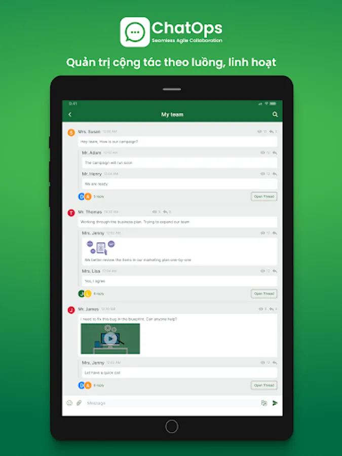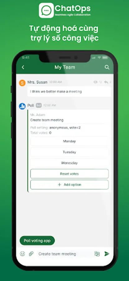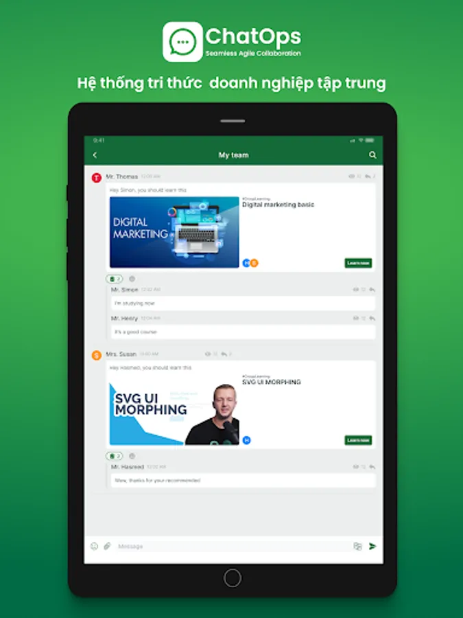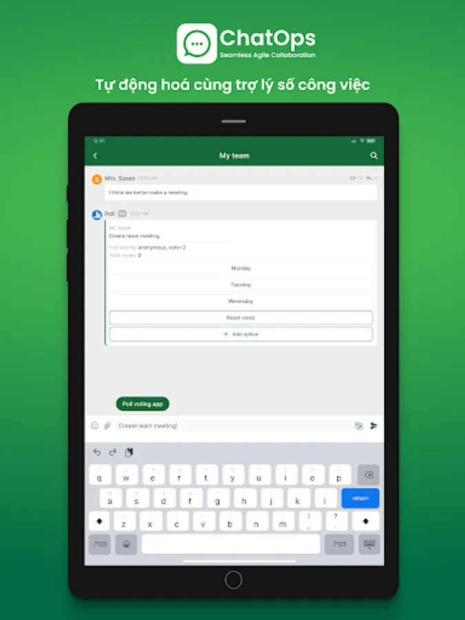 "ChatOps - the leading enterprise seamless communication collaboration platform, is a digital workspace. ChatOps provides a full range of communication features that make work collaboration seamless, flexible, and accurate. believes in the right work channel, the right person at the right time.The platform that promotes human-machine collaboration with deep application of AI and Machine Learning to enhance automation, intelligentize work towards the job. Data mining for quick decision making ChatOps provides 4 main features: