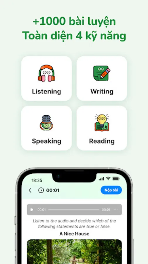 Tích hợp hơn 1000 bài luyện từ vựng, ngữ pháp và 4 kỹ năng, Cây Study giúp bạn nâng cao trình độ một cách toàn diện. Không chỉ vậy, ứng dụng còn cung cấp hơn 100 bài thi thử giống như thi thật, với giải thích và gợi ý để bạn tự tin hơn trong mỗi bước tiến mới.