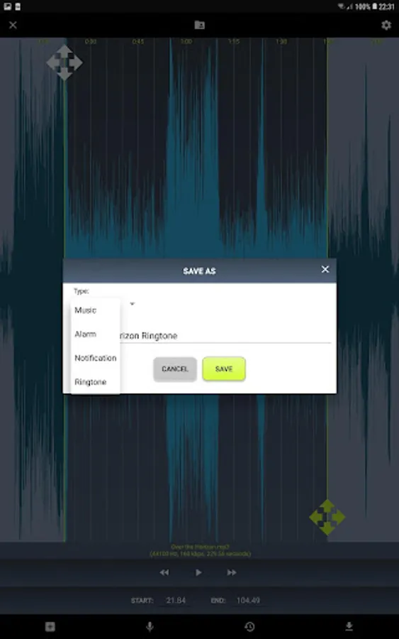 - Allows cutting and saving in formats such as: Music, notifications, ringtones, alarms.