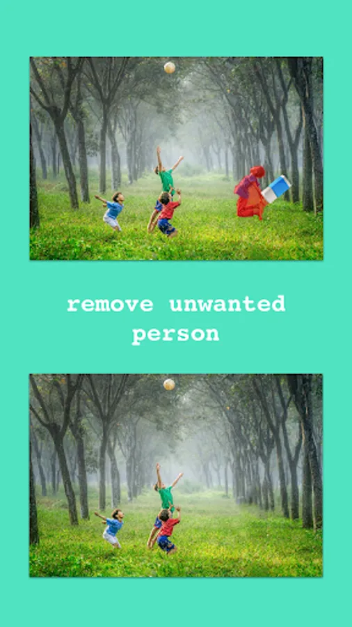With this application you can remove unwanted object of photo, you can eraser person, eraser object, eraser sticker or text on your photo. It's all free!
