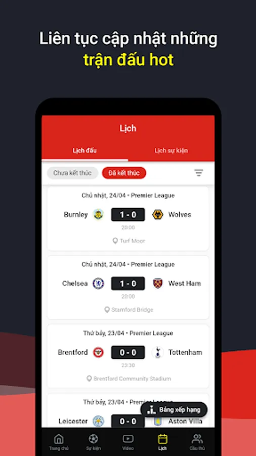The application updates the match schedule, results, and match happenings continuously to help fans track information quickly.