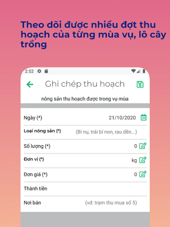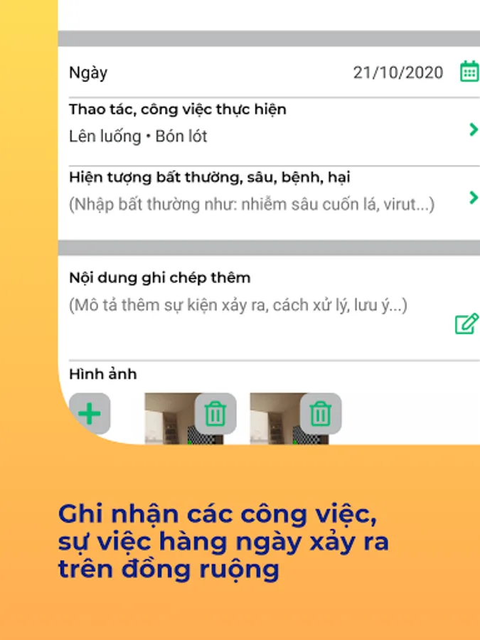Support farmers to record technical manipulations, events, abnormalities ... in the field. In addition, you can easily save information about the use of fertilizers, pesticides, and other materials (tarpaulins, hanging ropes, irrigation pipes ...). Thereby, it is easy to synthesize the costs, track the whole cultivation process in the most scientific way.