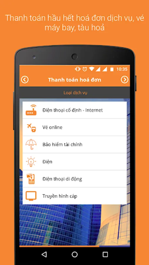 - Pay many types of bills: mobile phone, landline phone, Internet, electricity,…