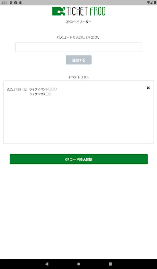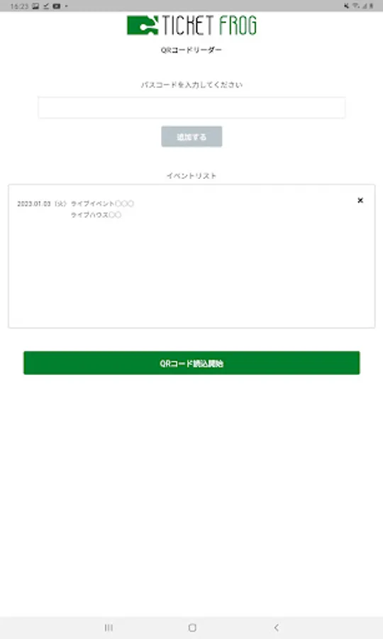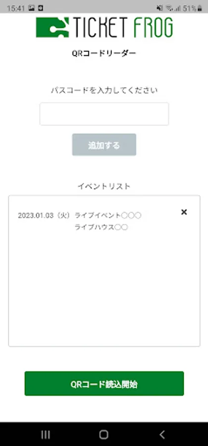 Events that can read QR codes can be added by entering the passcode notified by the administrator. (Only added events can be read)