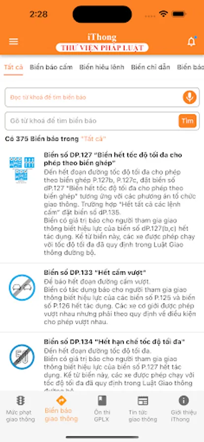- Search content is divided into 11 groups so customers can easily look up such as: Instruction instructions; Stopping or parking vehicles; Alcohol content, stimulant; Redirecting and giving way; Priority equipment, whistles; Safe distance speed; Transporting people and goods; Equipment and facilities; Forbidden roads, one-way streets, Vehicle papers, and other behavior groups.