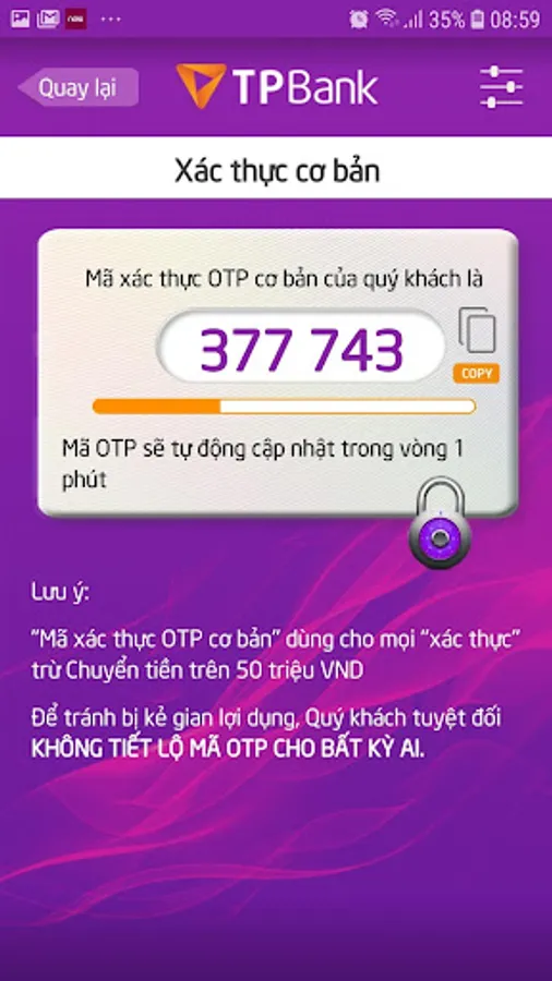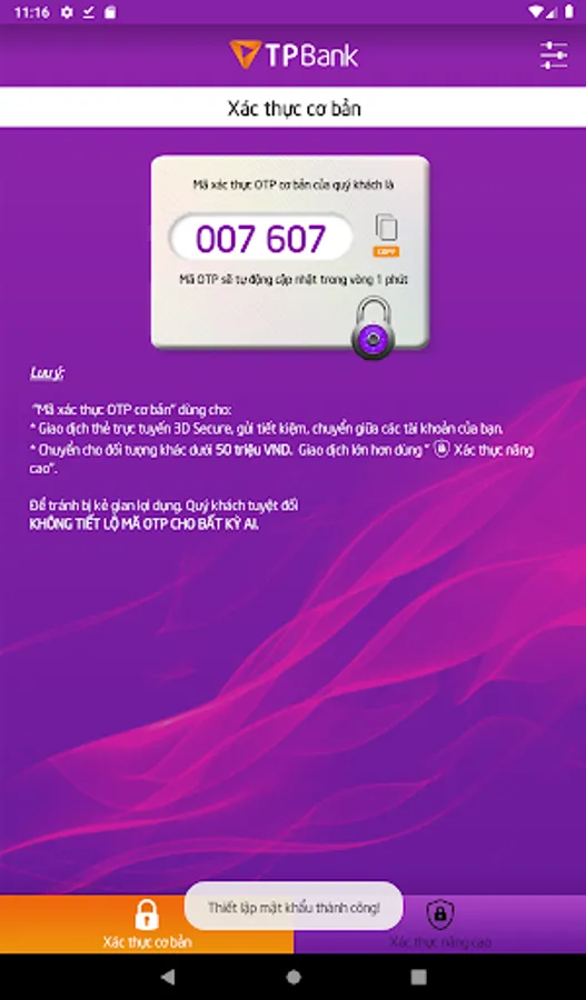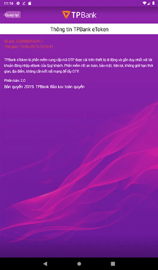 Tien Phong Bank's eToken security applications installed on the mobile device to get the code and add unique OTP login account with eBank customer. Rated as alternative authentication method offers traditional Vietnamese for SMS OTP, Tien Phong Bank eToken will definitely bring customers the experience completely satisfied with the following features: