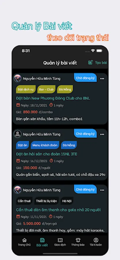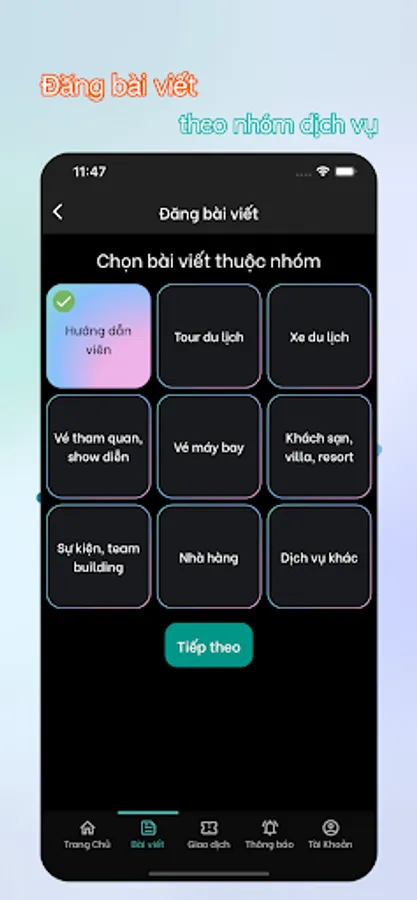 - Account: Register an account via phone number, verify OTP message. Each account will choose the field of Tourism in which they operate to post, receive notifications of related news.
