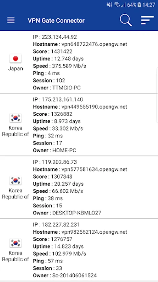VPN Gate Connector is an application allow user find free VPN Server owner by volunteer around the world from VPN Gate open source project. VPN Gate Connector simple is a VPN Gate Client