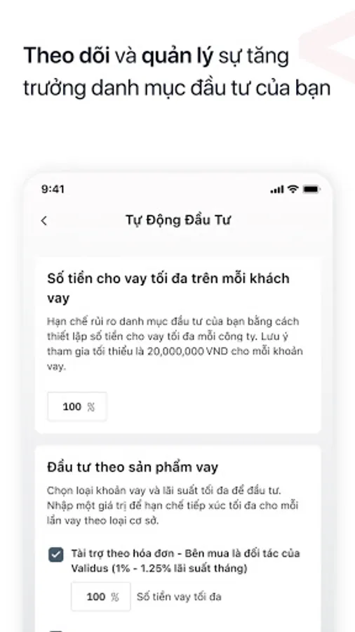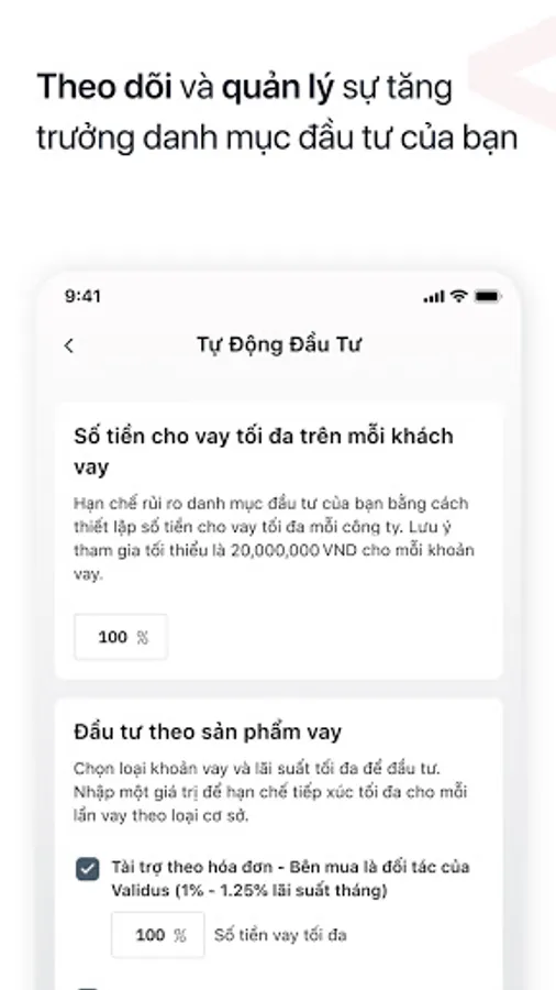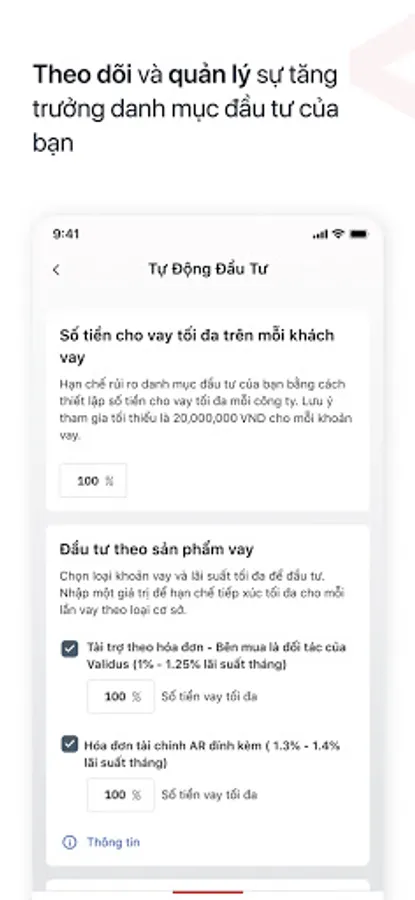 Hãy đăng ký tham gia đầu tư cùng Validus để trải nghiệm cơ hội đầu tư hấp dẫn mang lại lợi nhuận cao hơn mặt bằng thị trường, đồng thời hỗ trợ trực tiếp cho các doanh nghiệp được vay và trợ giúp cho nền kinh tế nước nhà phát triển hơn.