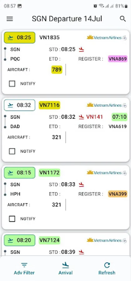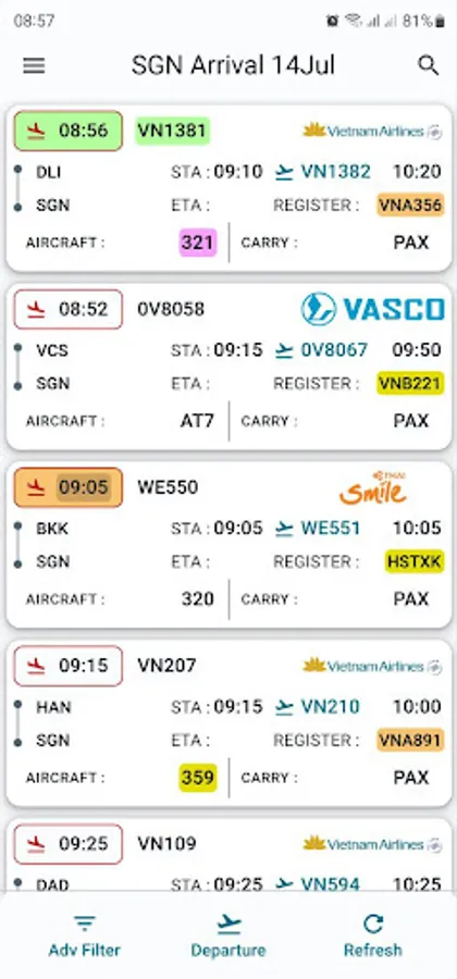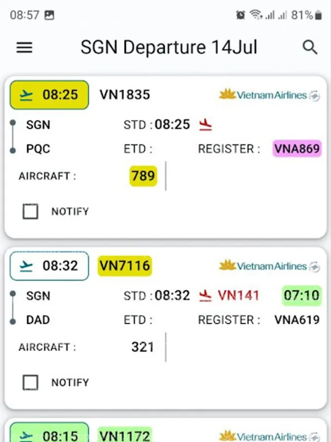 - View daily flight schedule (departure time, arrival time, departure gate, baggage carousel)