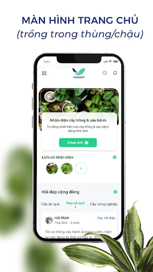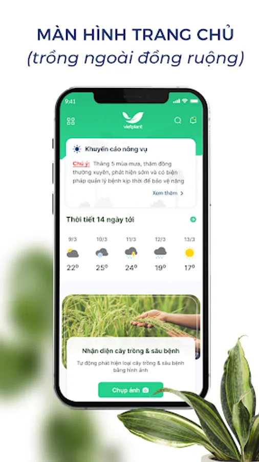 VietPlant - Cây trồng Việt là ứng dụng cung cấp giải pháp tổng thể và toàn diện phát triển nông nghiệp theo hướng chuyển đổi số. Ứng dụng được tích hợp công nghệ nhận diện và chẩn đoán cây trồng, sâu bệnh hại bằng AI (trí tuệ nhân tạo), hệ thống cơ sở dữ liệu – Big Data về thông tin kỹ thuật canh tác và các mô hình sâu bệnh trên cây trồng, ứng dụng công nghệ IOT cung cấp các thông tin chuyên sâu về thời tiết.