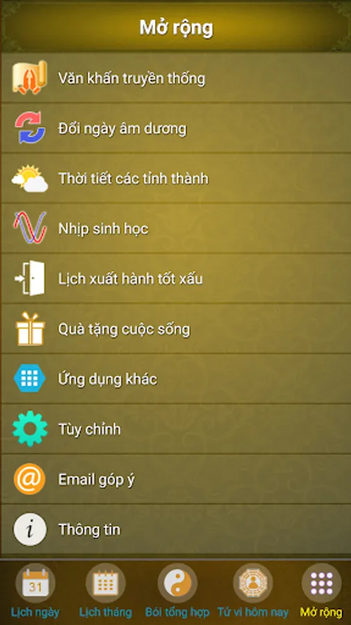You will have access to a wide range of useful features such as divination, horoscope, spiritual life activities such as making vows, watching the zodiac day, good and bad times, ...
