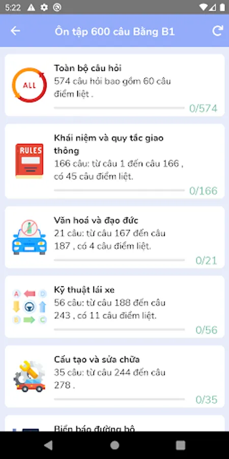 - Set of 600 questions according to the standards of the Ministry of Transport