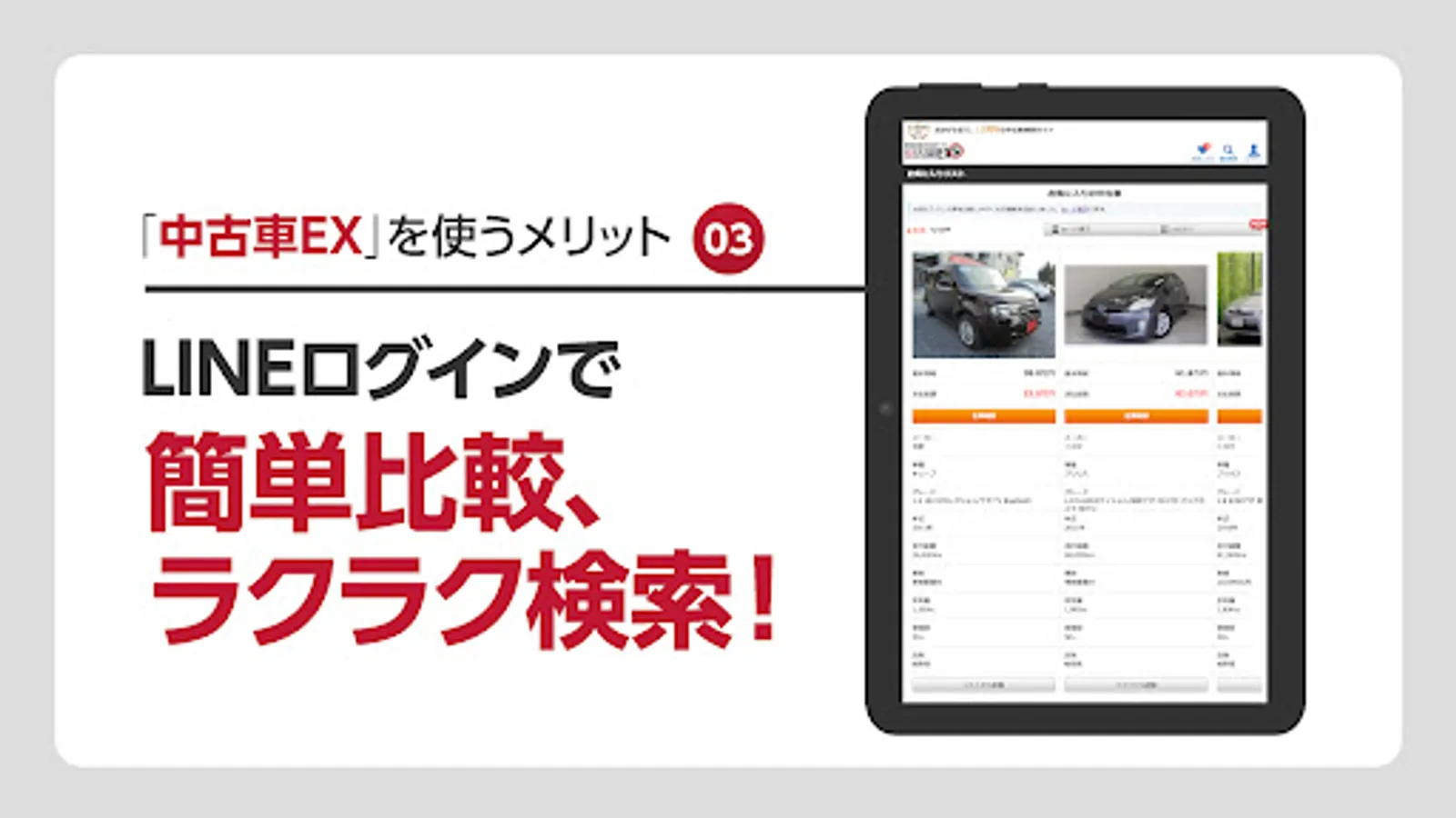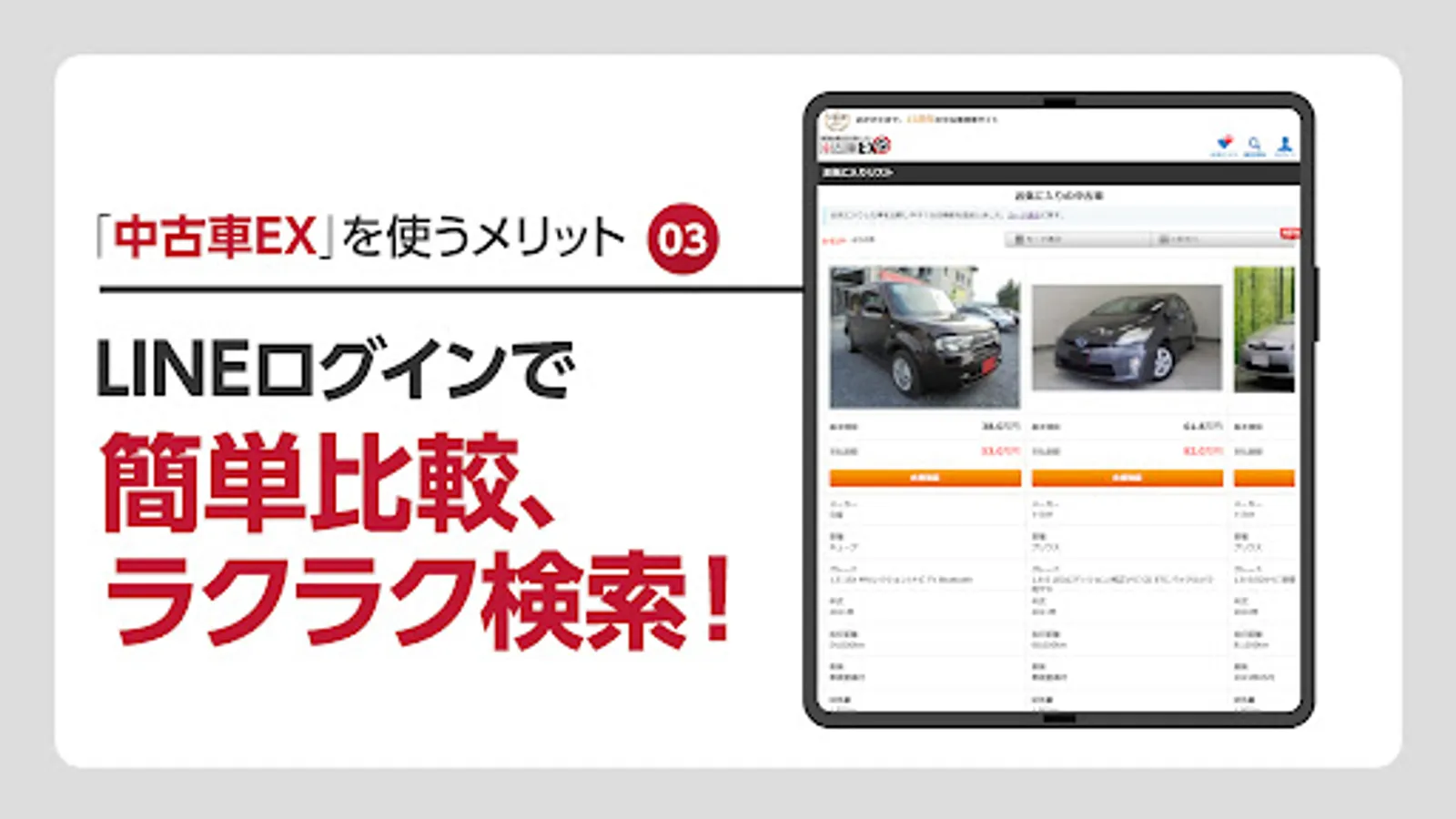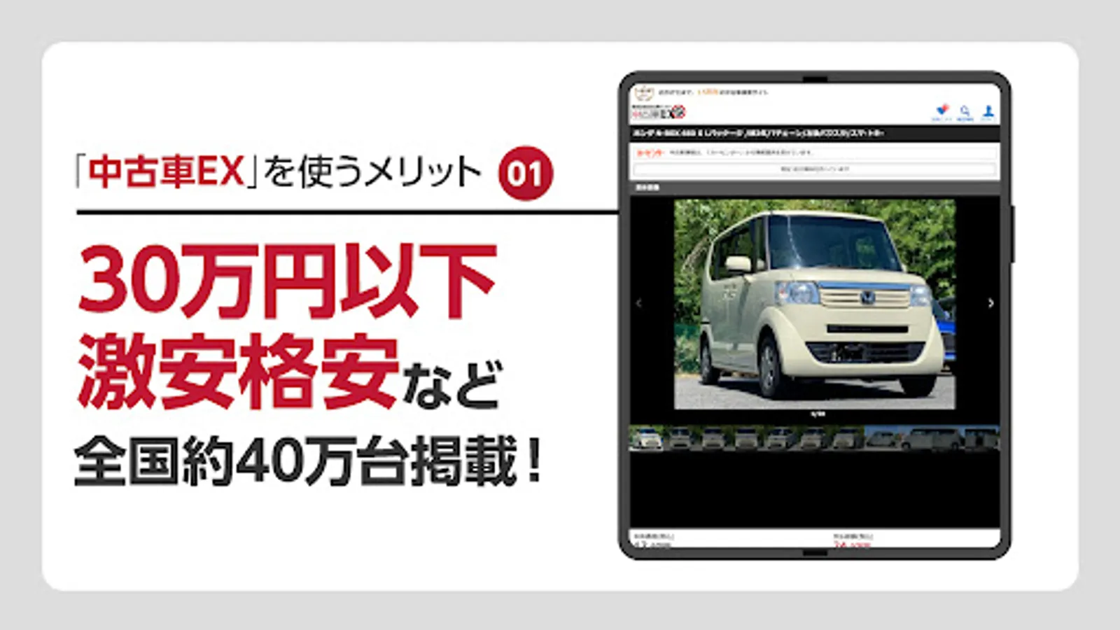 中古車検索アプリ「中古車EX」は、全国約50万台の中古車・販売店の新着情報を豊富な条件で検索できる中古車探しのアプリです。