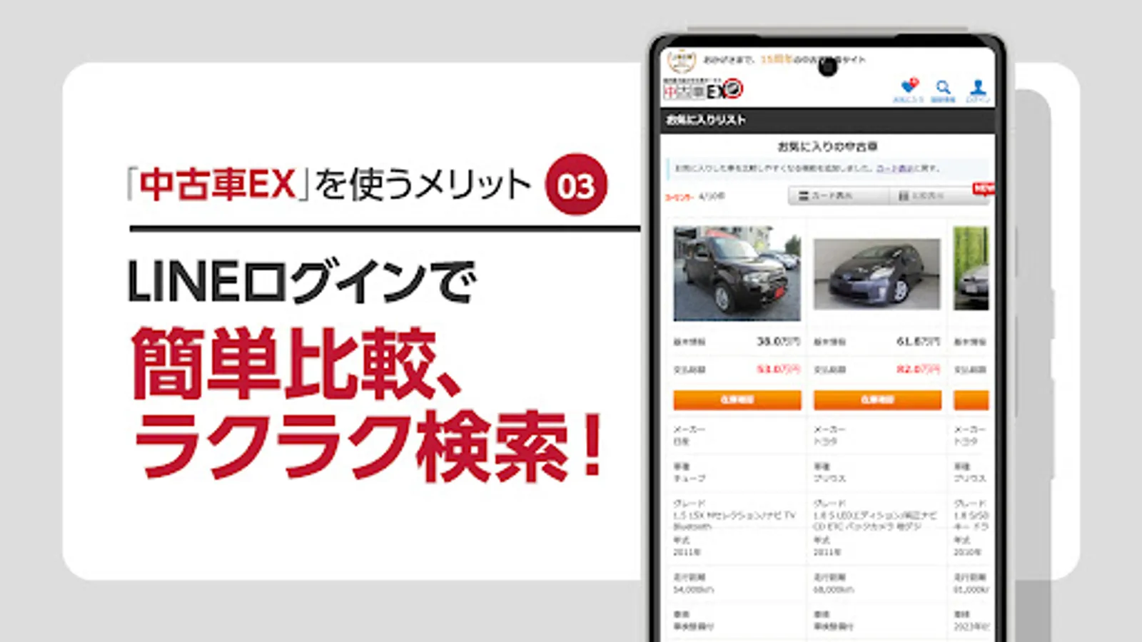 ◎LINEログイン機能:LINEのアカウントで中古車EXにログインして5つの機能を全開放!LINEで新着車両・値下げ通知や販売店をお気に入りに追加して、新着情報の見逃しを防ぎましょう。