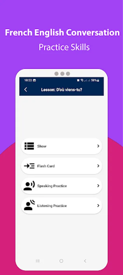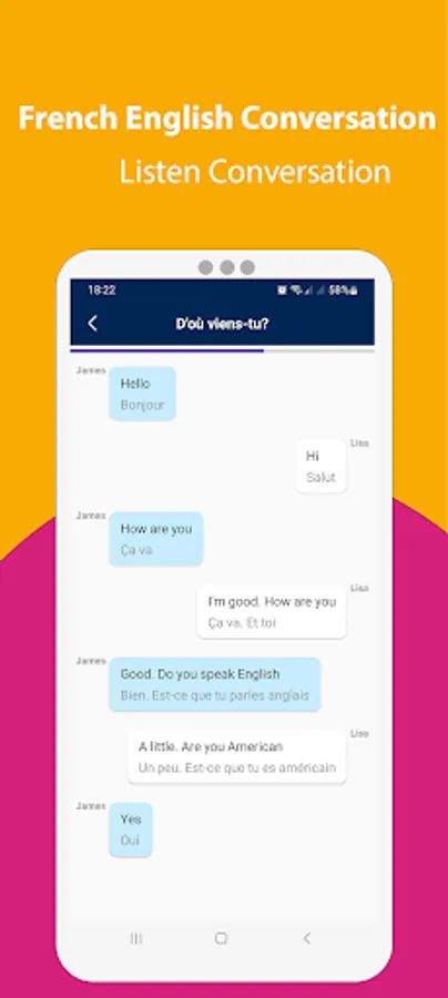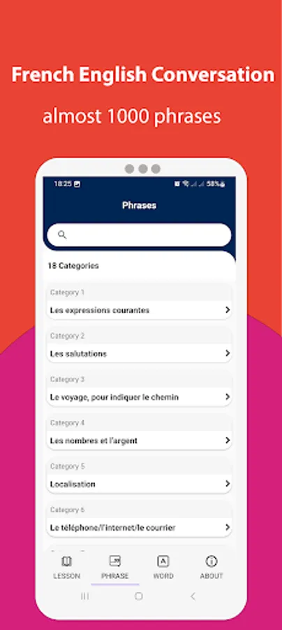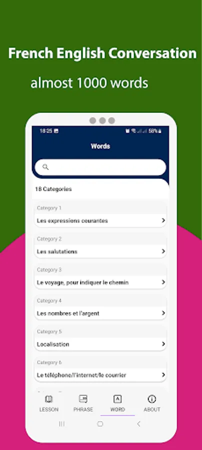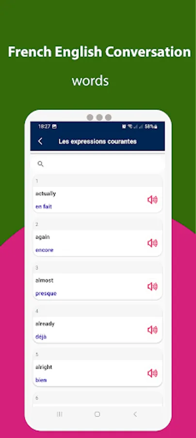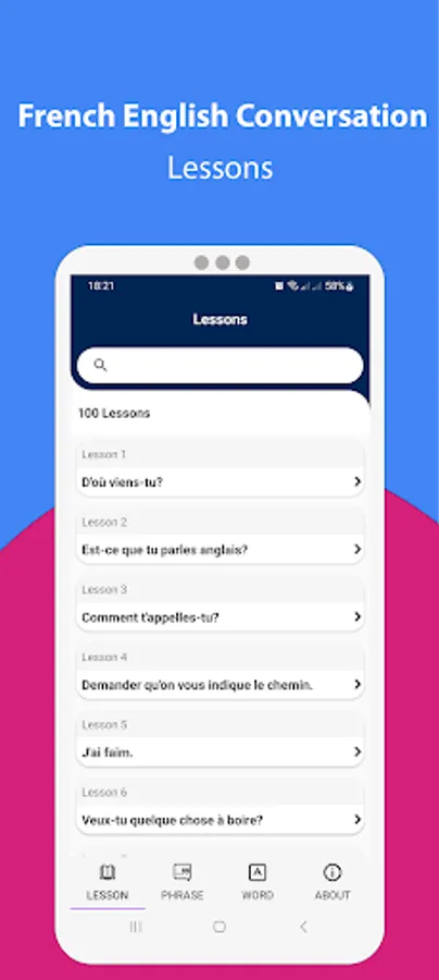 French English Conversation includes 100 lessons, 1500 vocabularies and 1000 phrases for your daily conversation.