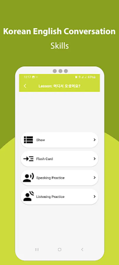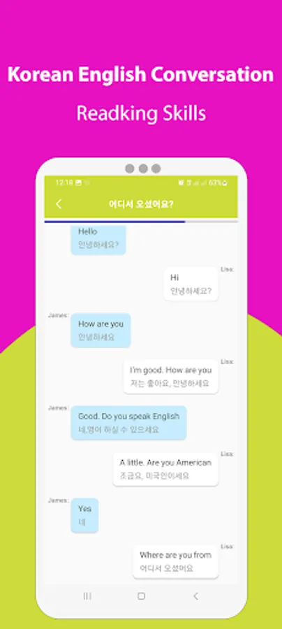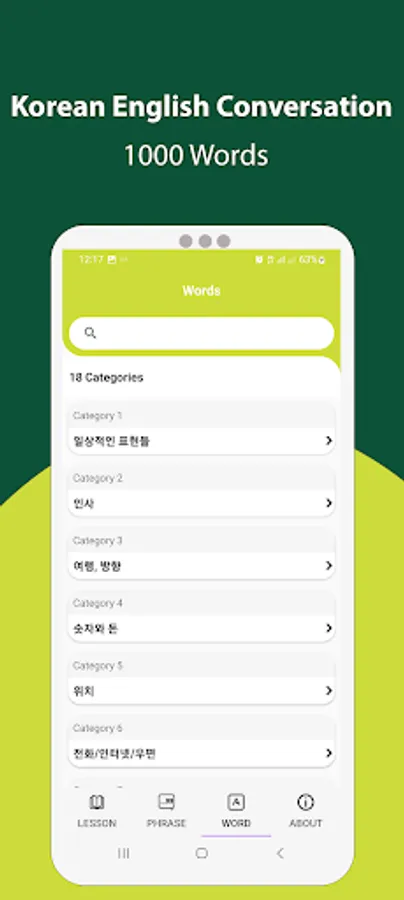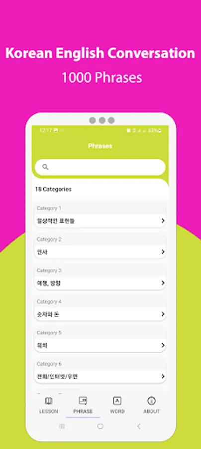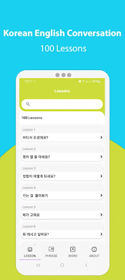 Korean English Conversation includes 100 lessons, 1000 vocabularies and 1000 phrases for your daily conversation.