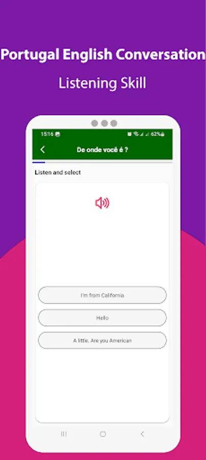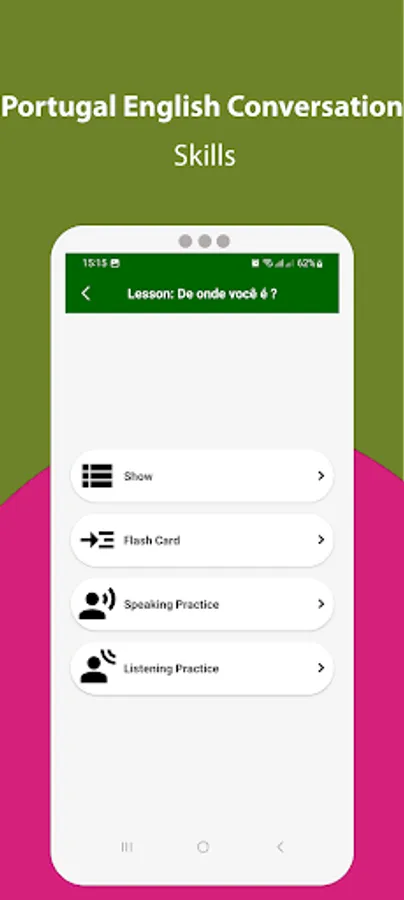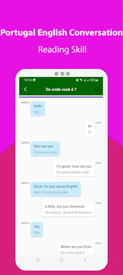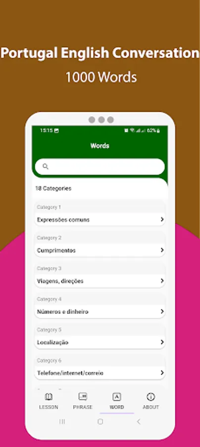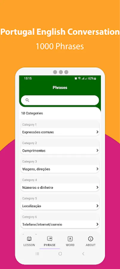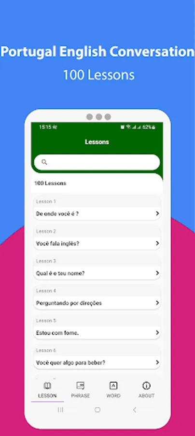 Portugal English Conversation includes 100 lessons, 1000 vocabularies and 1000 phrases for your daily conversation.