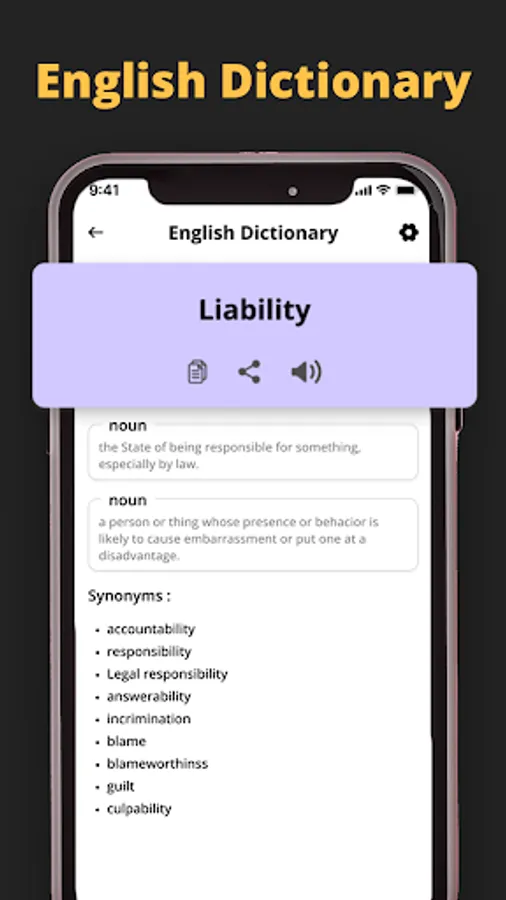 Photo Translator has an inbuilt Offline English Dictionary to search words. Just search words and the result comes with in-depth meanings, synonyms, antonyms, etc.
