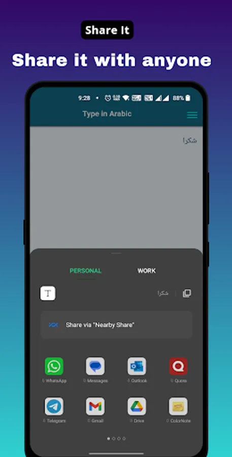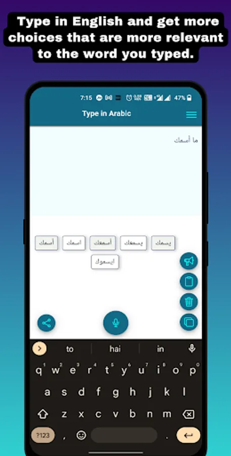Copy the typed Arabic text and use it anywhere on emails, chat, facebook, watsapp, twitter or anywhere you want. Type In Arabic ( Arabic Voice Typing ) makes very easy and simple to type in Arabic using English. Just type the text in English and press space, it will convert the text in Arabic. Yes, this Arabic typing app has options like Click on a typed word to see more options related to Arabic language.