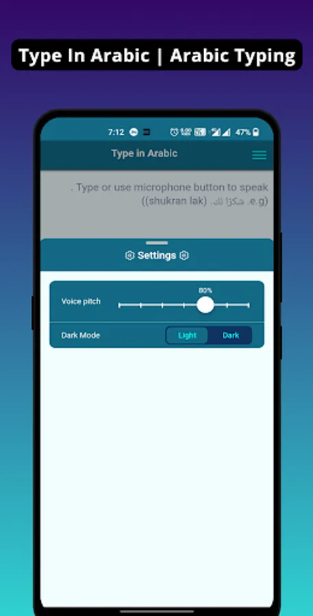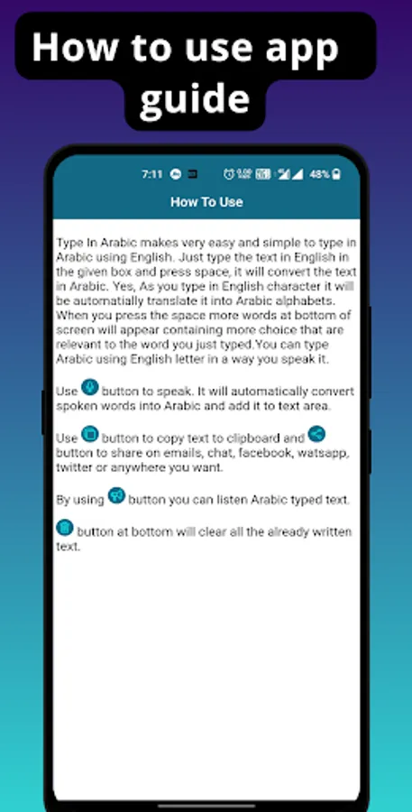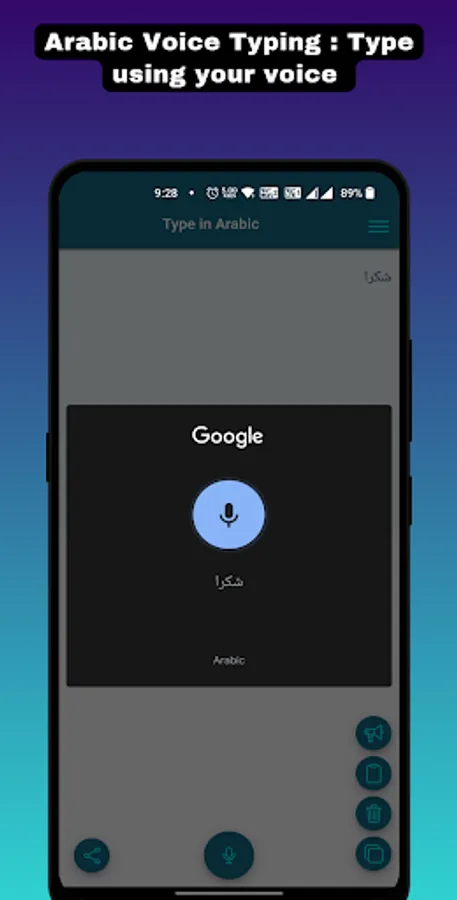 - App contains android's inbuild voice translator feature to make it look like translator AI (Artificial Intelligence) which will convert your voice into Arabic text. Using this voice Arabic typing feature you can type as many as words, paragraphs, stories or notes in Arabic without using keypad. just simply speak in Arabic using mic icon and it will add those spoken word into text. After that you can use this text to share on any social media platform which is in Arabic.