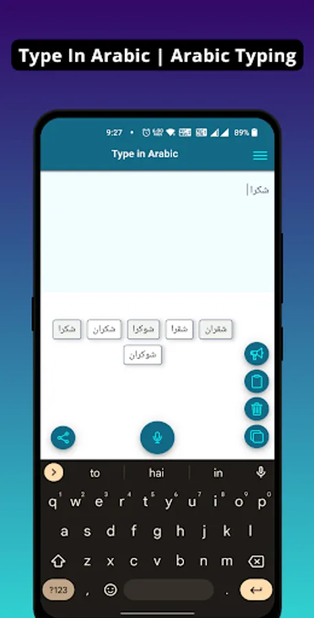 Type In Arabic ( Arabic Voice Typing ) makes very easy and simple to type in Arabic using English. Just type the text in English and press space, it will convert the text in Arabic. Yes, this Arabic typing app has options like Click on a typed word to see more options related to Arabic language.