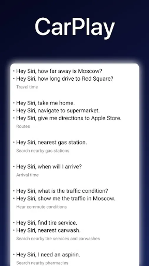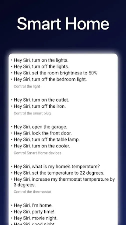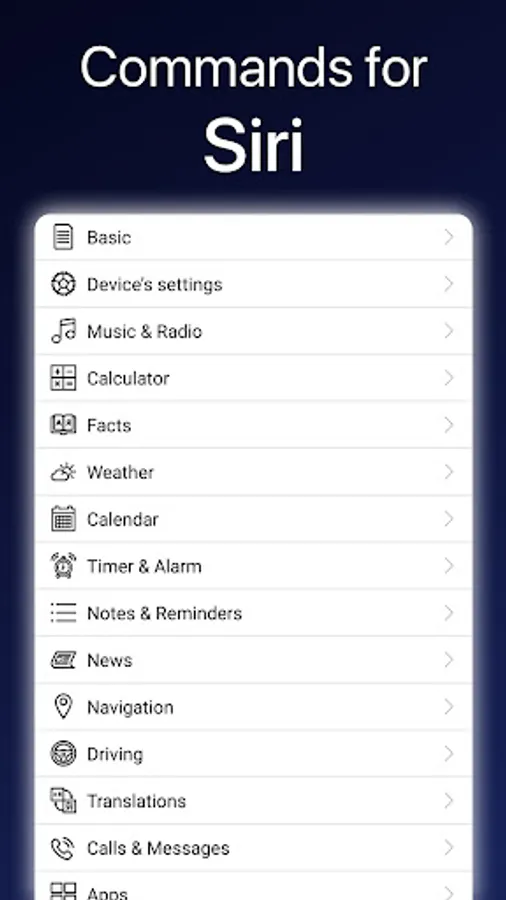 This app provides a full list of commands for Siri, voice assistant by Apple. The commands are divided into categories: