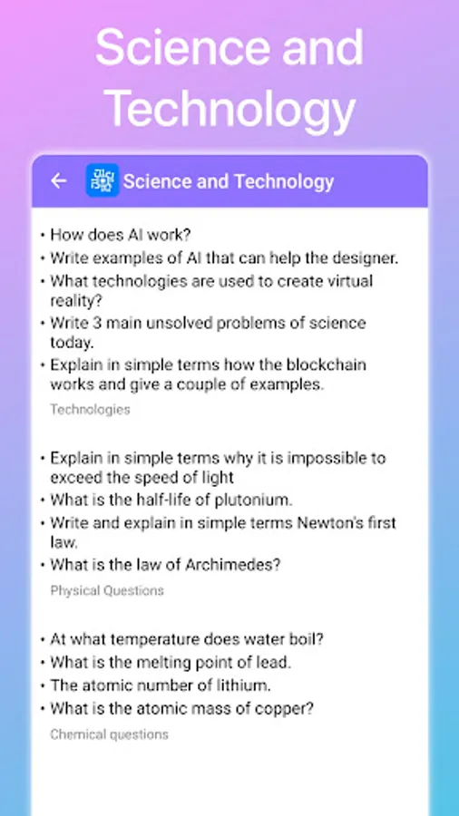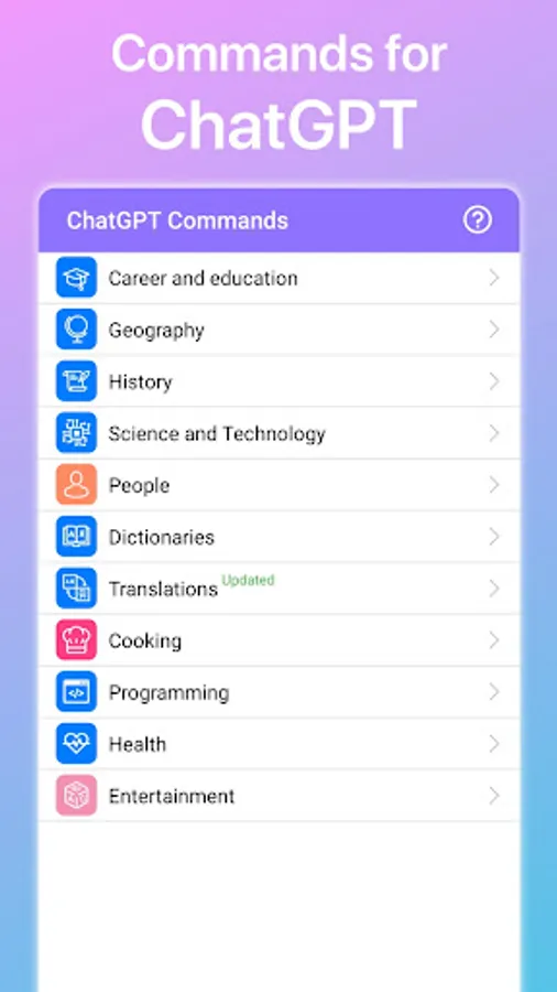 This app provides a full list of commands for ChatGPT, artificial intelligence chatbot by OpenAI.