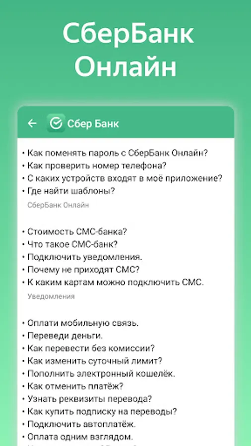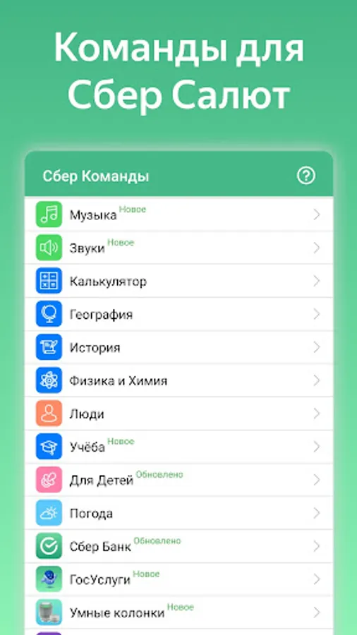Basic. Music. Sounds. Calculator. Geography. Story. Physics and chemistry. People. Studies. For children. Weather. State Services. Smart speakers. SberBox. SberPortal. Smart House. Time and date. Calendar. News. Places and routes. Purchases. Games. Secret commands.