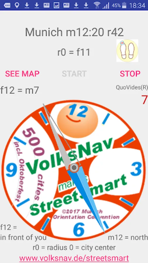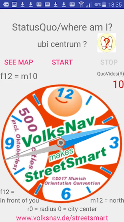 The app uses GPS and compass and - a worldwide innovation - indicates the direction to the centre of town only with a graphic but also with text which also the blind can understand !!