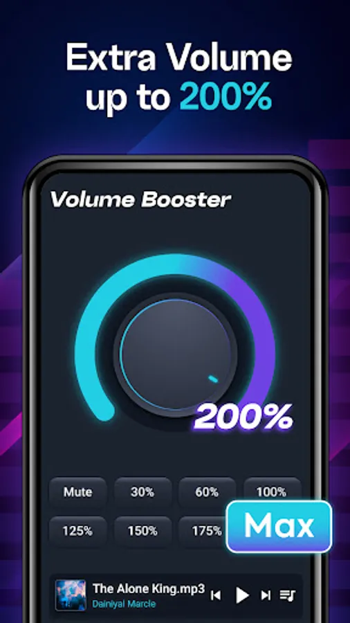 Bass booster is a simple volume equalizer for Android phones. The sound booster app increases the loudness of music played on the phone. To boost volume speaker, the music equalizer is used as a tool to increase speaker sound. Volume can be increased on your phone above the system default using the speaker booster app. Extra volume booster increase speaker volume and make your phone sound louder. Without affecting the sound quality, the sound booster can increase the volume on your phone by up to 200%. Volume boost app can increase the volume of all kinds of media i.e. videos, music, ringtones, alarms, etc. Bass booster supports sound boost on speakers, BlueTooth, headphones, and all other devices. The boost volume app also has a built-in music player to boost volume on phone. The built-in audio player of the speaker booster can display the music cover, song title, and artist name, support play/pause, and switch to the next/previous song. Users can increase the sound on a phone with a bass booster without damaging actual sound quality. Enhance the bass of the music to the maximum level. Control the tone of music with a volume equalizer booster. Save multiple customized sound equalizer settings.