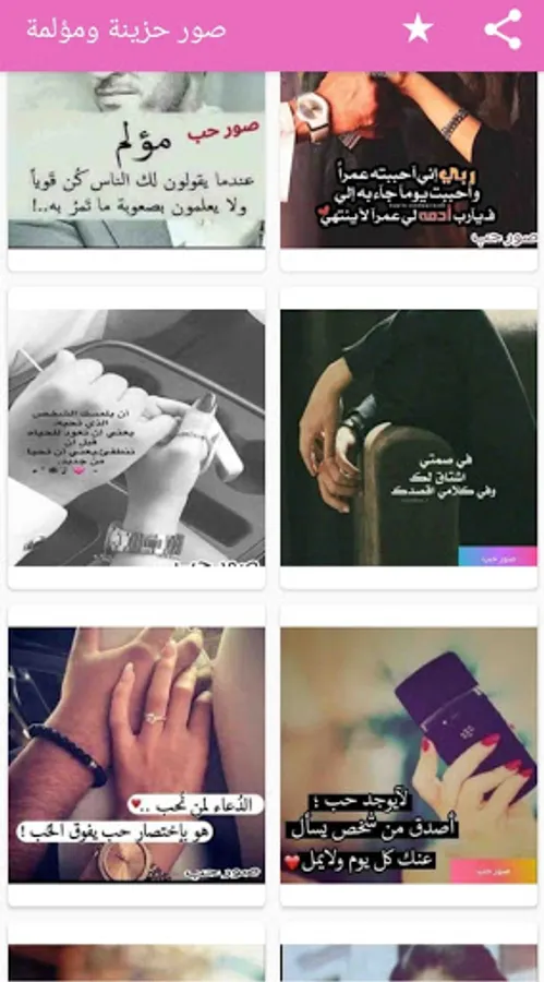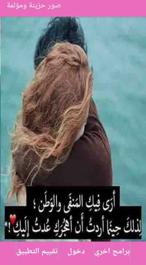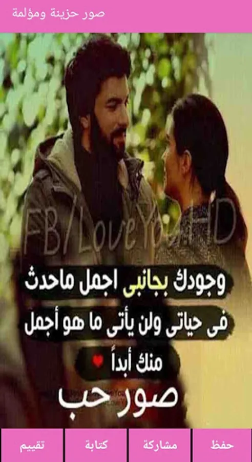 يحتوى هذا التطبيق على أروع وأجمل صور الحب و الحالات الرومانسية و رسائل مكتوب عليها عبارات حب و أشعار حزينة , ويمكنك هذا التطبيق كدلك من حفظ الصور في هاتفك .