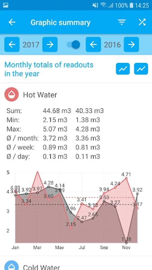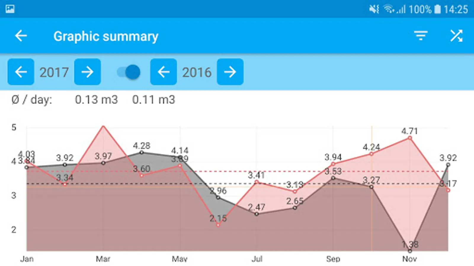 Consumption is evaluated in relation to the meter type. In case of the incremental (basic) type, from 2 values of the related months it is calculated consumption of the current month (the same applies for the chart), and in the case of 3 values it can be already counted a unit saving / increase compared to the previous month. In case of the absolute (special) meter type, the consumption is the read value and only two values are sufficient to display the difference.Of course, measurements can be carried out a week or a day and the chart takes it into the month summary!