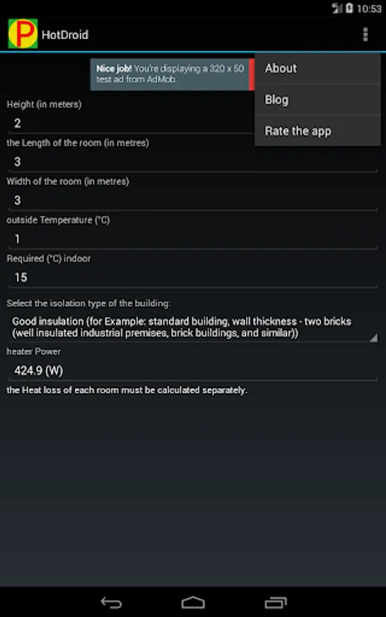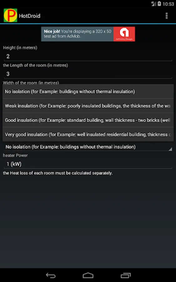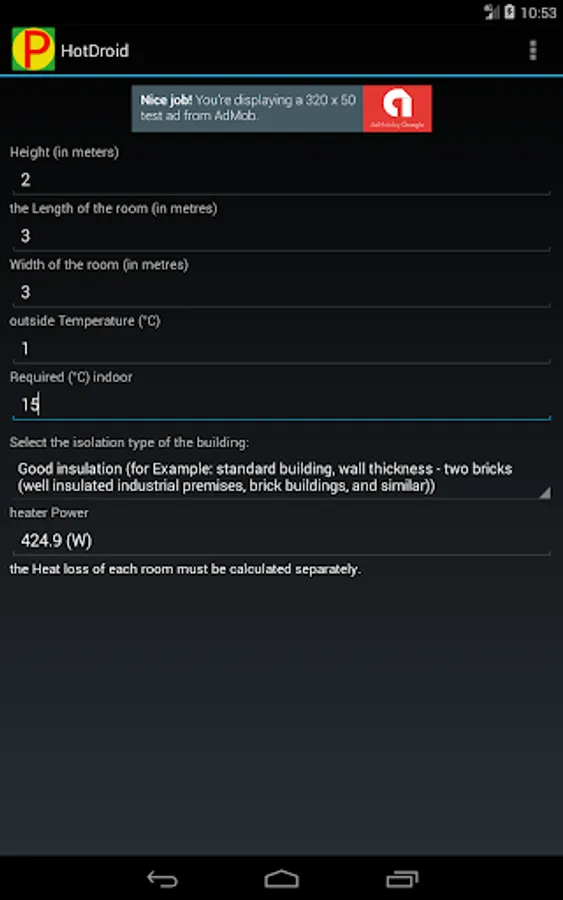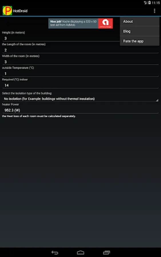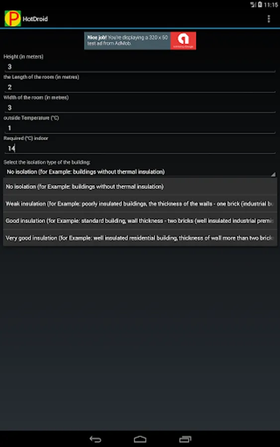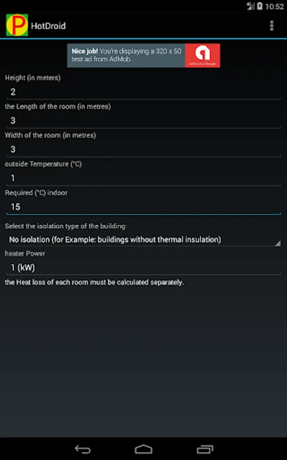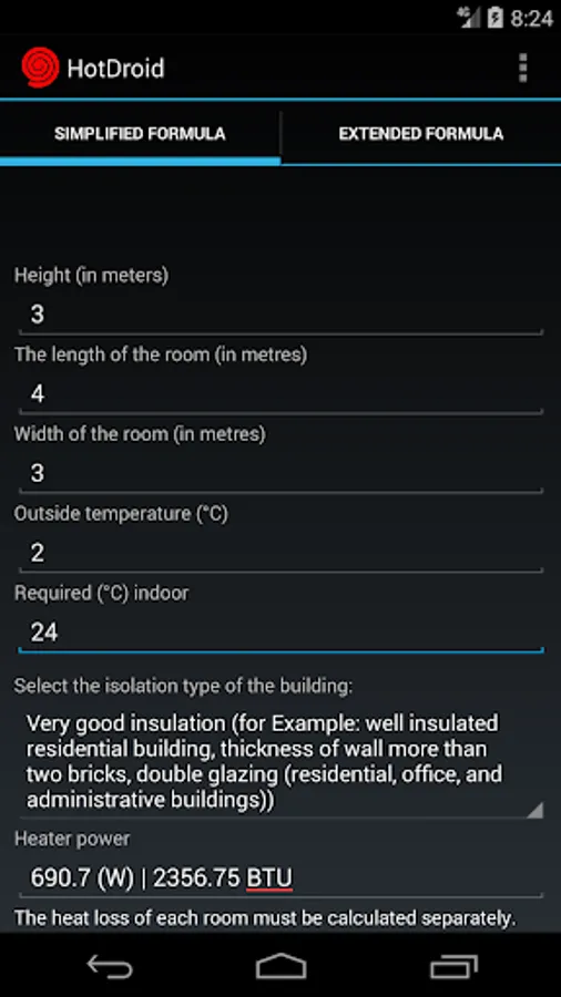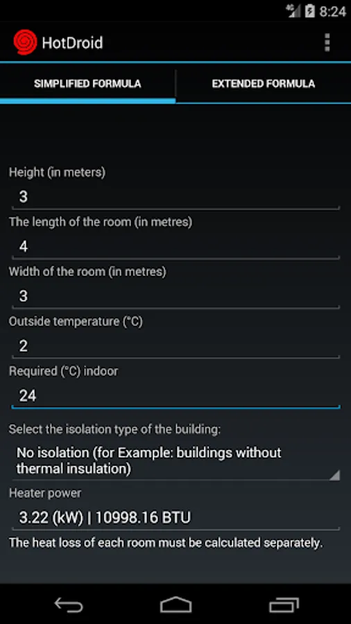 Electric heating calculator, calculates the electric power of the heater required for space heating, taking into account the desired temperature difference by the formula: V x T x k = kcal/HR, where: