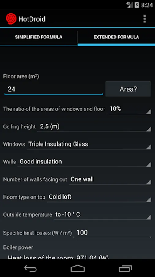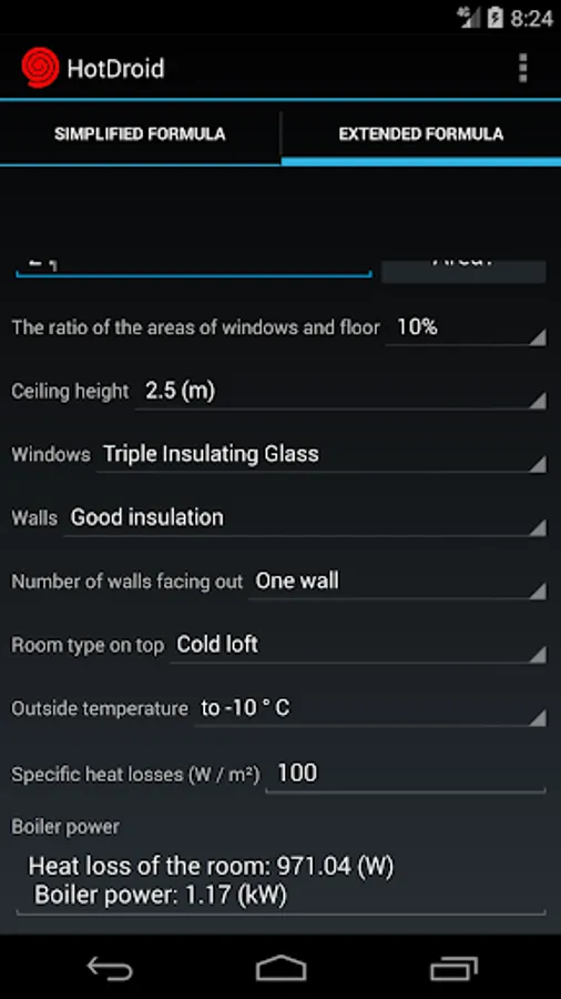 k — coefficient of heat loss (or heat insulation). Ranges from 4.0 (for buildings with very poor insulation) to 0.6 (high thermal insulation).