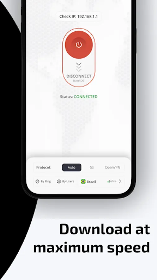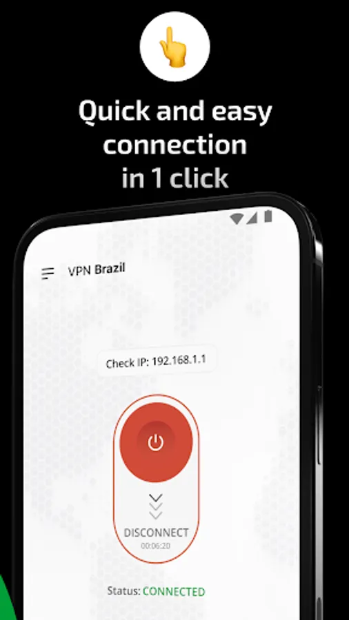 + For your convenience, we introduced two separate connection buttons. The first connects to a selected VPN in the list. The second connects directly to a Brazil VPN. It's that simple. In case you need to change IP address, just select a server in some other country and establish a connection. In case you need to get a Brazil IP address, just connect to a Brazil VPN server in one click.