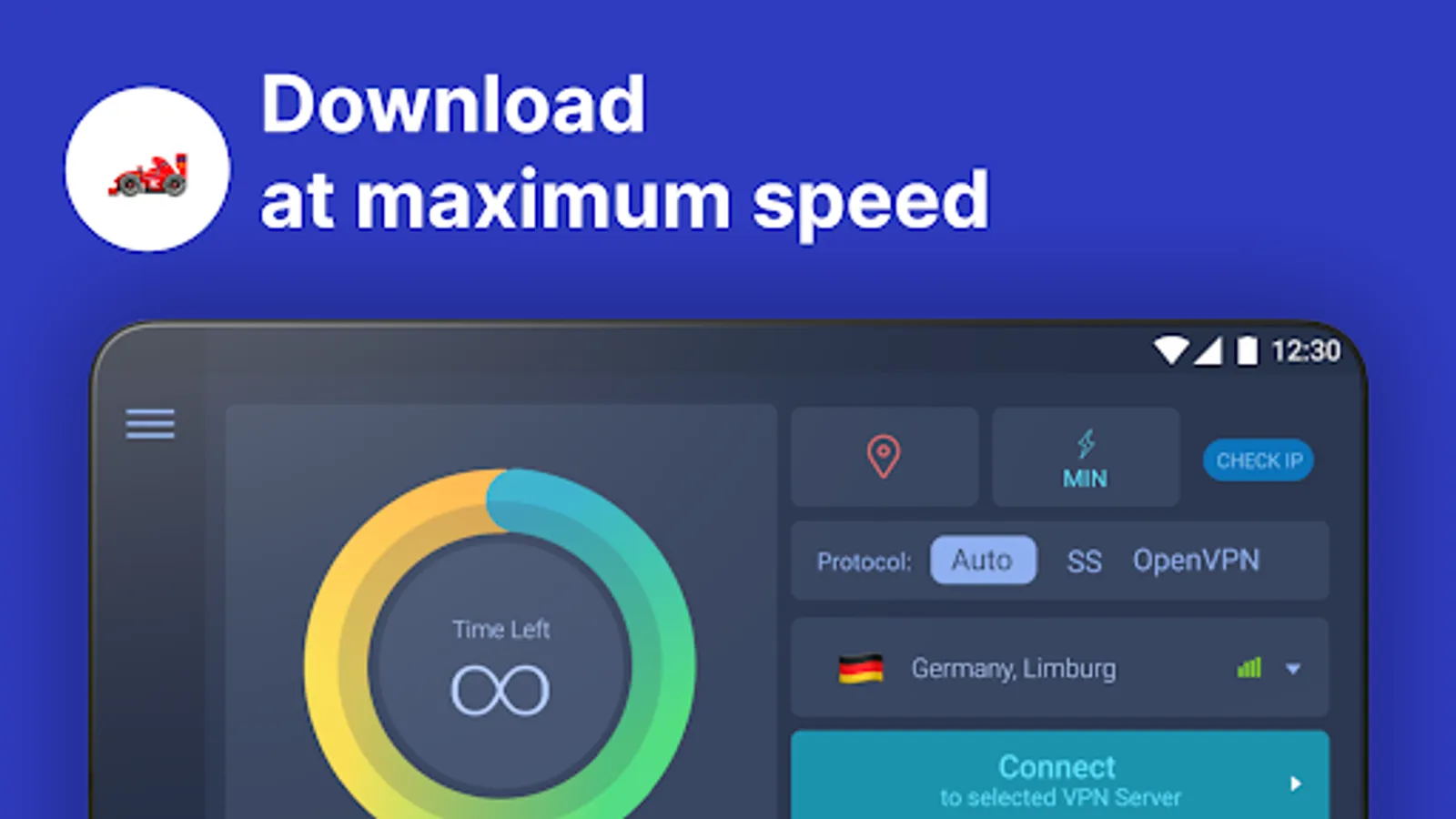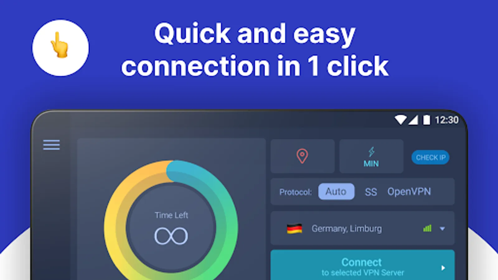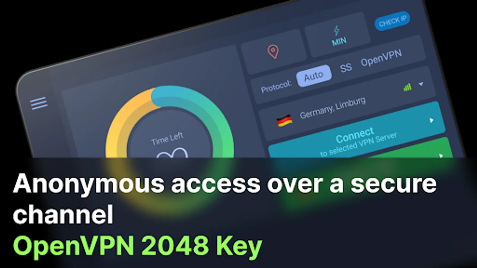 Launch VPN Israel to get an Israeli IP address with a single click or regain access to blocked websites and applications. Secure and confidential connection is provided by OpenVPN technology featuring OpenSSL support (key size is 2048 bit). High speed is achieved by means of Shadowsocks technology.