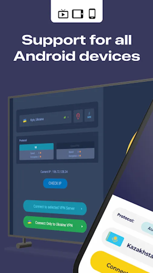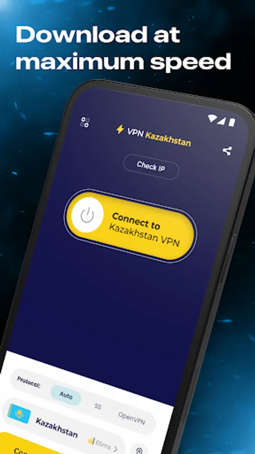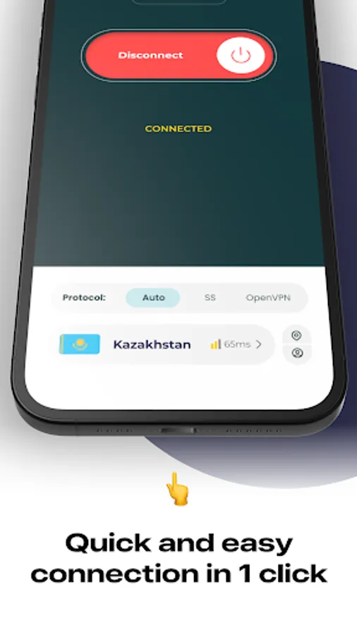 + For your convenience, we introduced two separate connection buttons. The first connects to a selected VPN in the list. The second connects directly to a Kazakhstan VPN. It's that simple. In case you need to change IP address, just select a server in some other country and establish a connection. In case you need to get a Kazakhstan IP address, just connect to a Kazakhstan VPN server in one click.