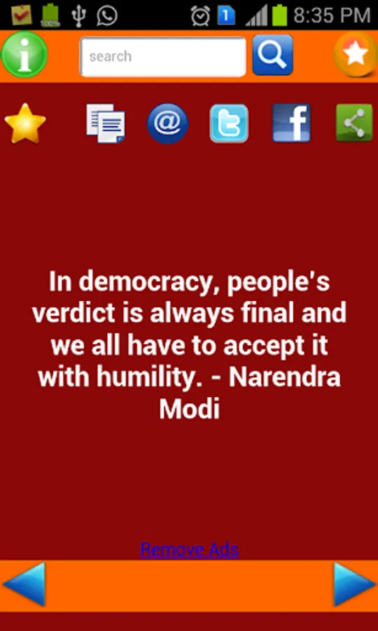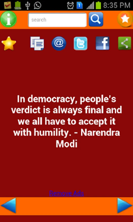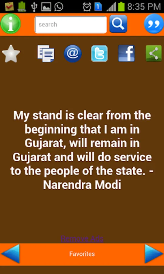 This app contains the famous quotes and sayings of Narendra Modi and the quotes can read, bookmark, copy or share to social networks.