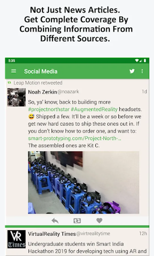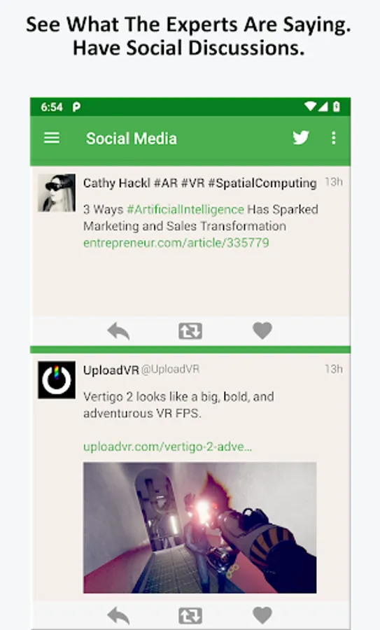 -- Discussion feed that aggregates news sources, and personalities from the Virtual Reality world into a single list of tweets, so you can hear what everyone has to say and respond to them in real-time.