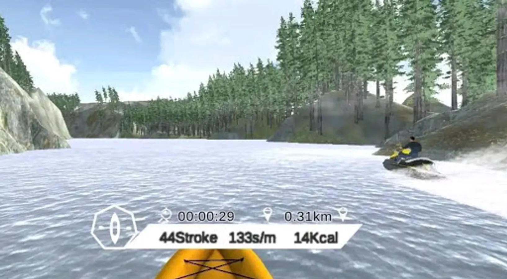Exercising is not boring anymore! Have fun riding the rowing machine on the wonderful 360 VR lake!