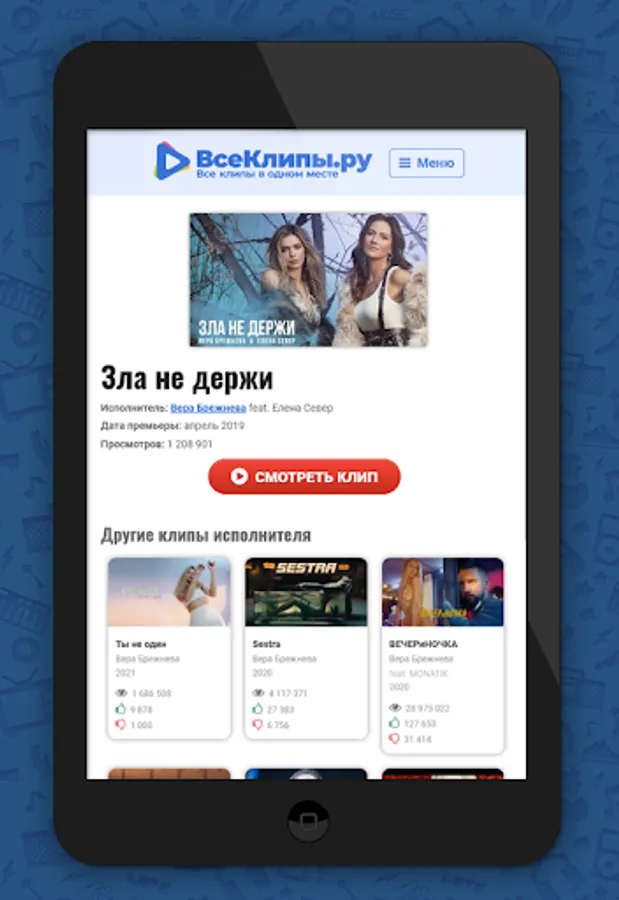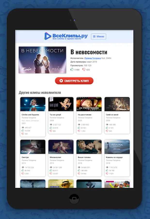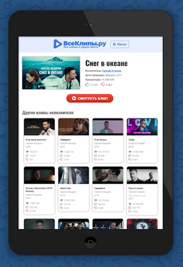 With the help of this application, you can watch clips of your favorite music artists for free and conveniently, as well as new clips and the most popular clips by the number of views and likes. You will have access to convenient sorting, filters, as well as statistics on views, likes and dislikes for each video.