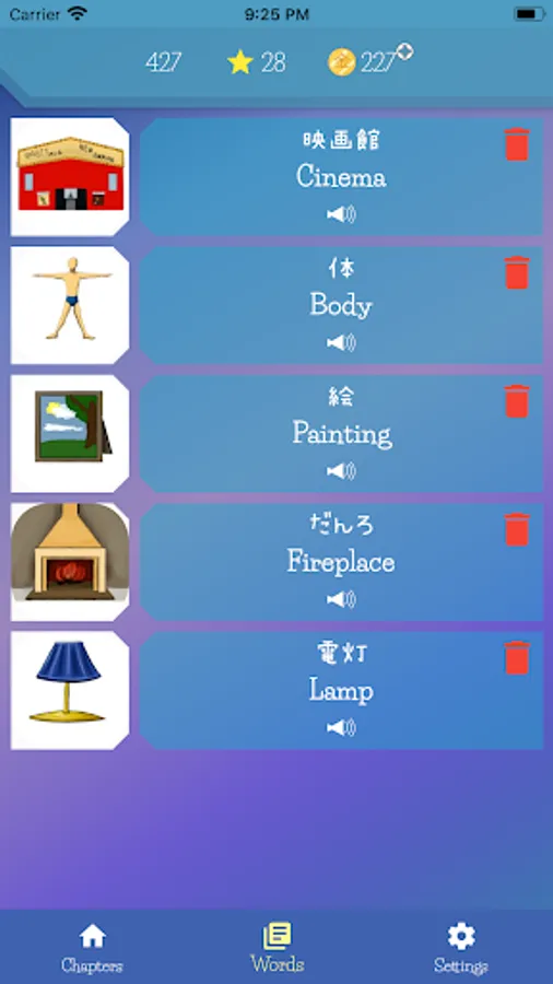 This learning educational game allows you to make your own list of favorite words so you will have easy access to it. If you have built-in Japanese voice (text to speech) on your phone (many phones do) then you will be able to listen to the sound of those words and learn Japanese vocabulary even faster! Learn Japanese words for everyday use.