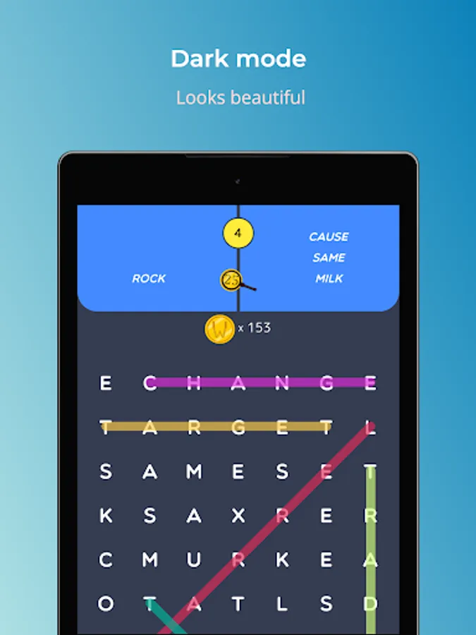 When you seek and finally find the word, it will be marked with a nice, colorful line. Each time, when your finger touches the first letter, a new color is chosen. It looks so nice, especially when the free night mode is enabled.