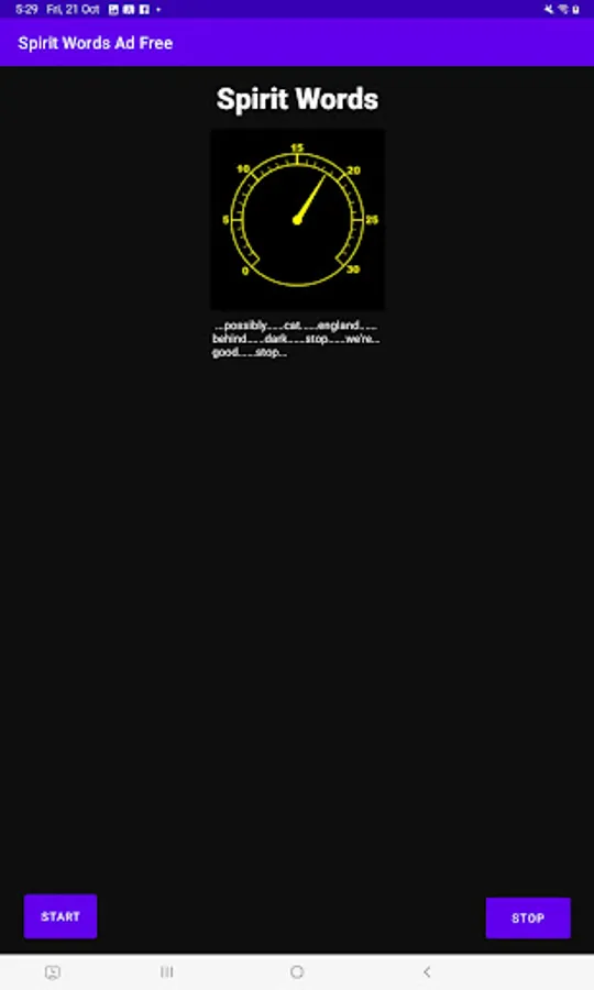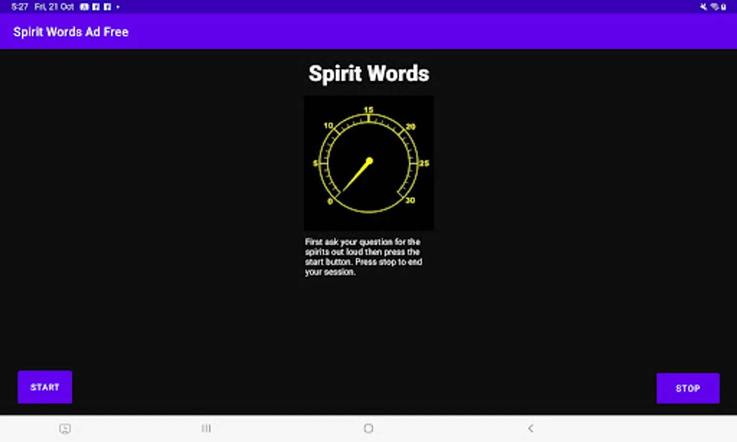 Are ghosts and spirits able to communicate with us using technology? There are many stories or people receiving messages from the other side through phone and computer technology. This app uses a database of random words that we believe spirits are able to use to communicate with us. Once you open the app state your intention or ask a question of the spirit realm then press the start button. Wait for a few seconds and our app will detect when a spirit has selected a word and it will appear on the screen. Press stop to end the connection with the spirits.
