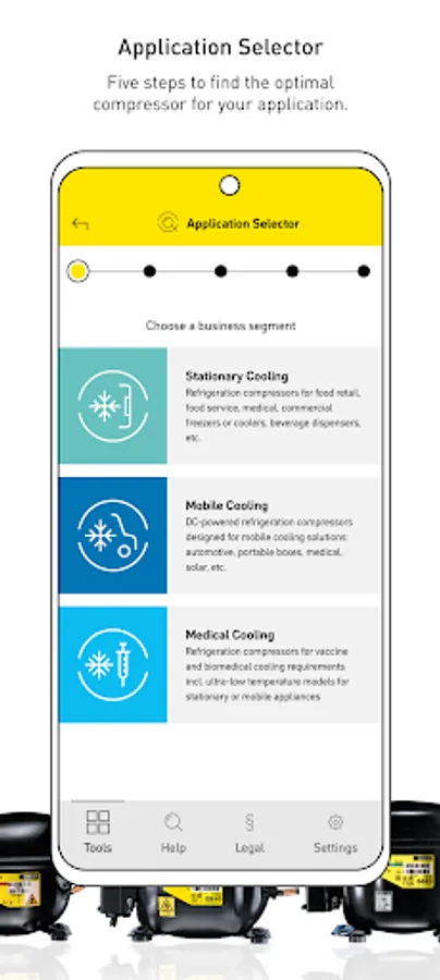 The Secop Application Selector helps users find the best compressors for specific applications and conditions in only 5 easy steps. Once the market segment, the application type, and size are chosen, the range is narrowed down to only a few compressors that meet the searched requirements.