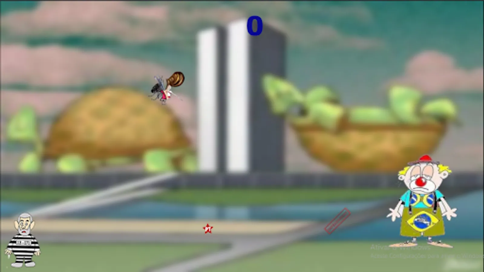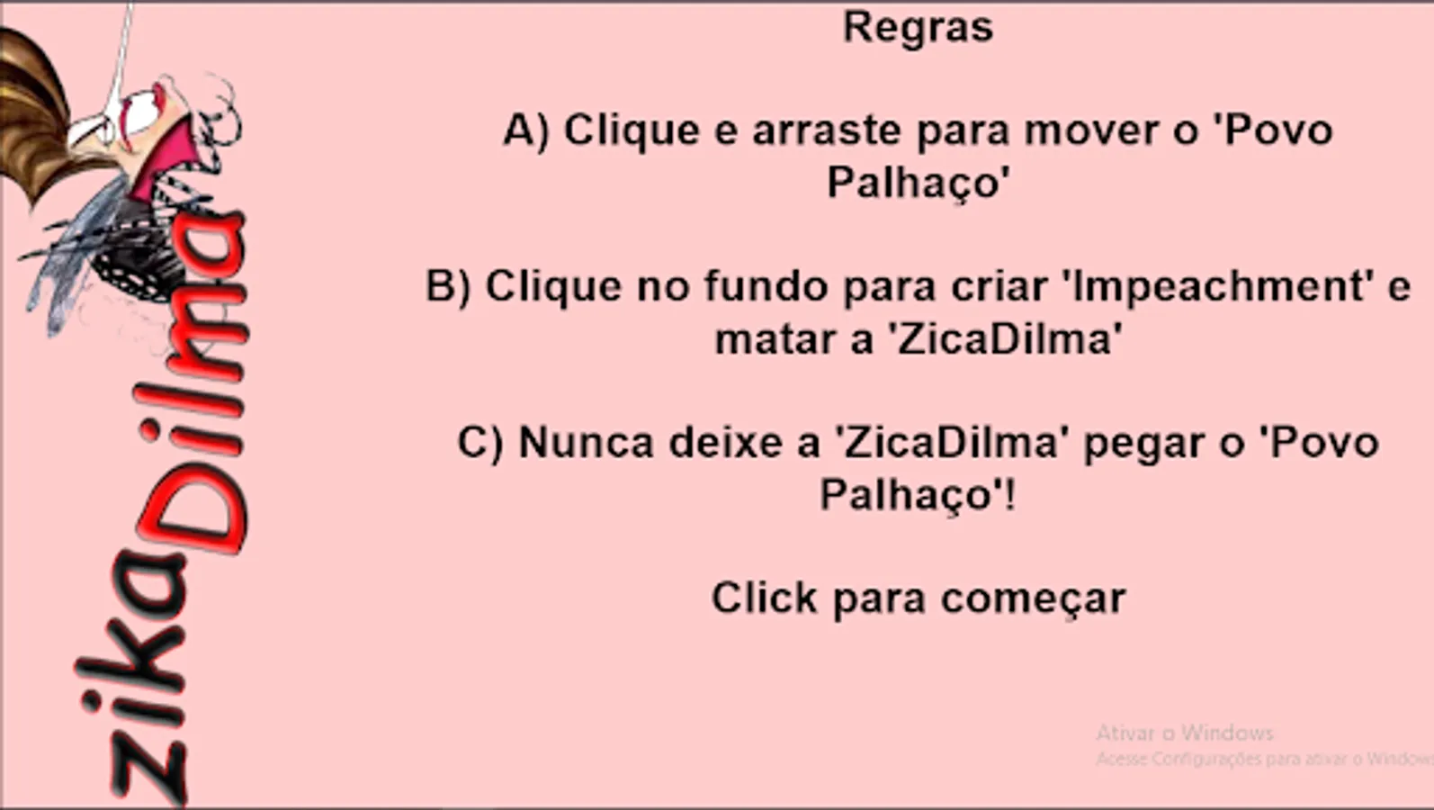 Action game in which you move one or more "Clown People" across the screen while the "Zika Dilma" mosquitoes try to bite you. To kill ZikaDilmas just by putting an impeachment in his way, but be careful, Lula will try to destroy your impeachment!