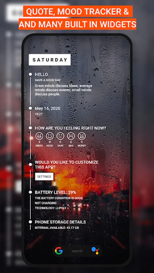 * Mood Widget: Track you're changing mood swings and assess your overall mood on an ongoing basis. You can reset and track from beginning anytime you wish to. Also, get a corresponding quote depending on your mood every time you click on the mood emojis.
