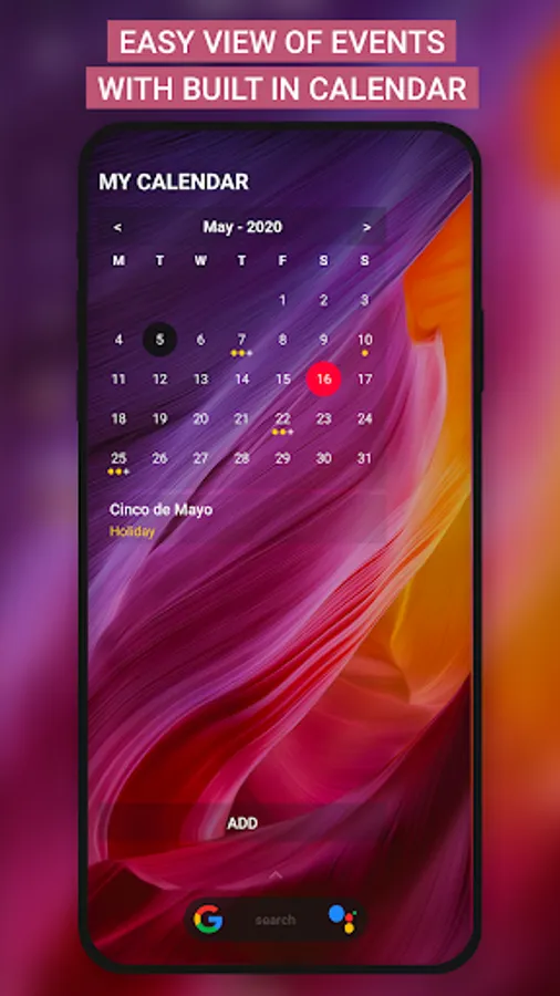 The calendar screen provides the calendar that highlights all the events that is integrated with your Google Calendar and Android calendar. You get the key events, holidays, etc on day to day view by selecting the day on the calendar.